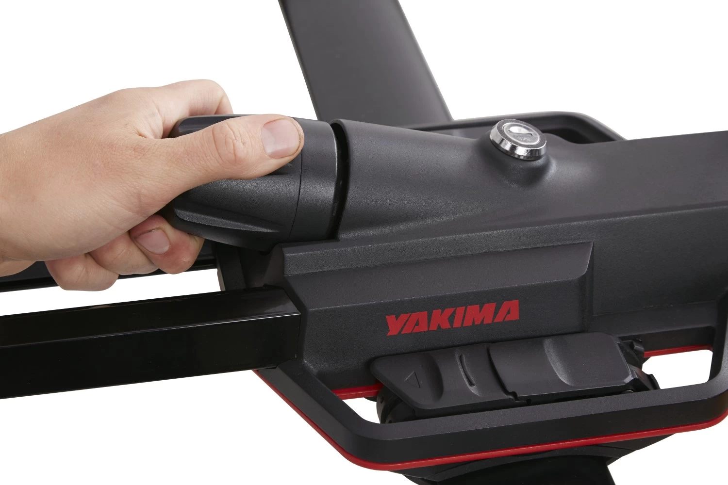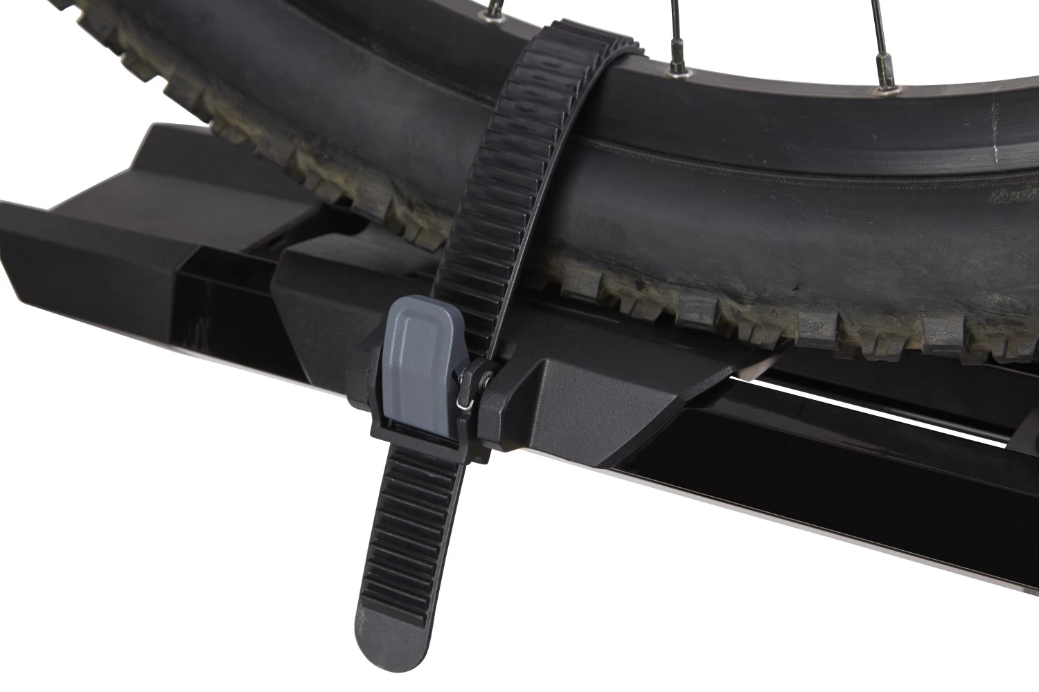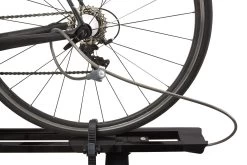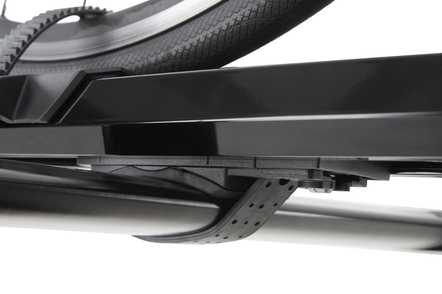 Thanks to the universal fastening method with tension straps, the Yakima HighSpeed fits on most types of roof bars from different brands. For mounting on roof bars with T-track grooves, the SmarT-Slot mounting kit can be ordered separately. The bike carrier is secured on the rear roof bar by means of a key lock. And with the integrated Tailwhip locking cable you can additionally secure your bicycle against theft. The Yakima HighSpeed is City Crash tested and complies with ISO 11154:2006.