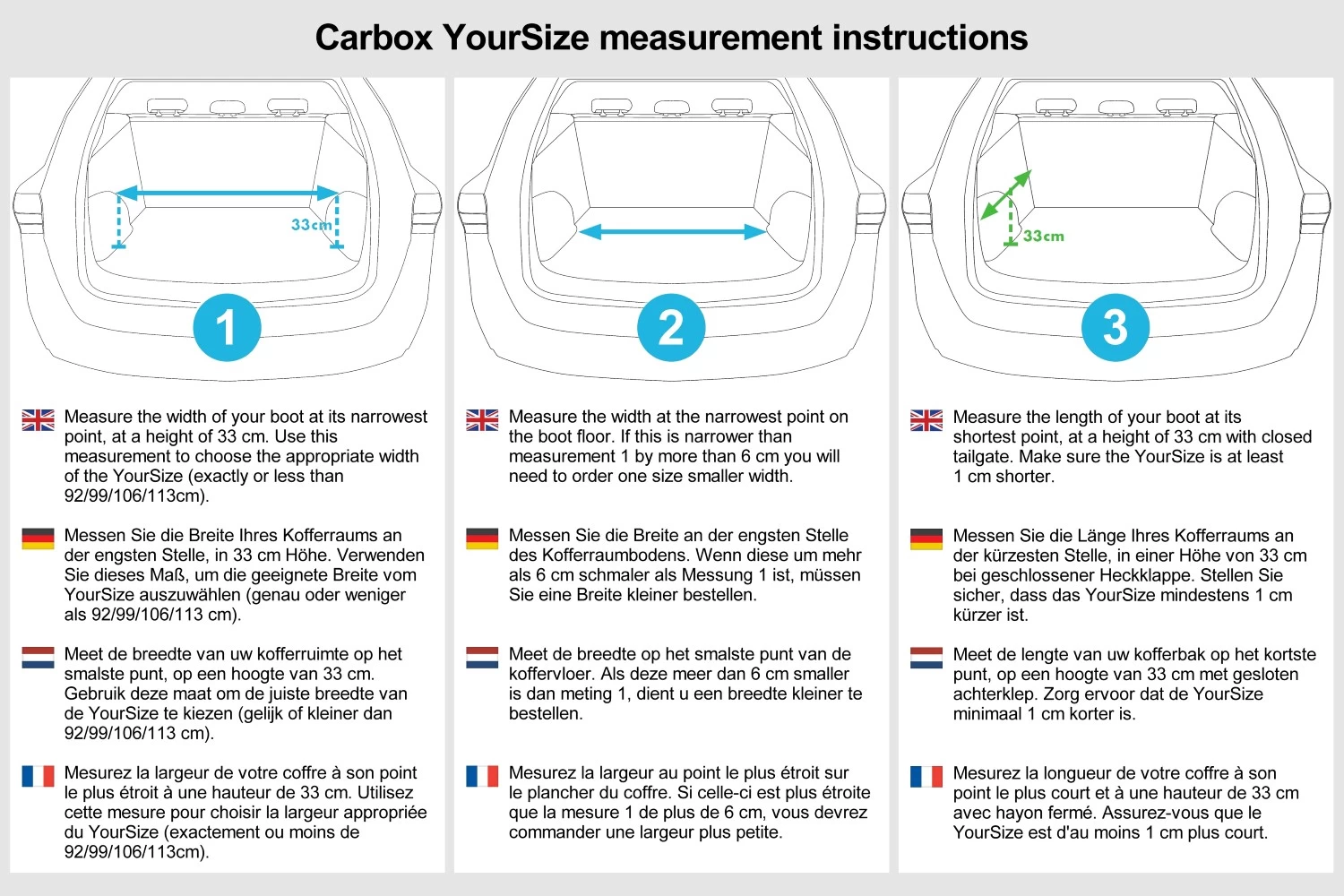 Please note: The Carbox Classic YourSize is the semi-universal variant of the Carbox Classic. Therefore in some car models there may remain a gap of a few centimetres around the boot liner. Before ordering this product we advise you to compare the product dimensions with those of your boot space. You can find the product dimensions above, near the product price.