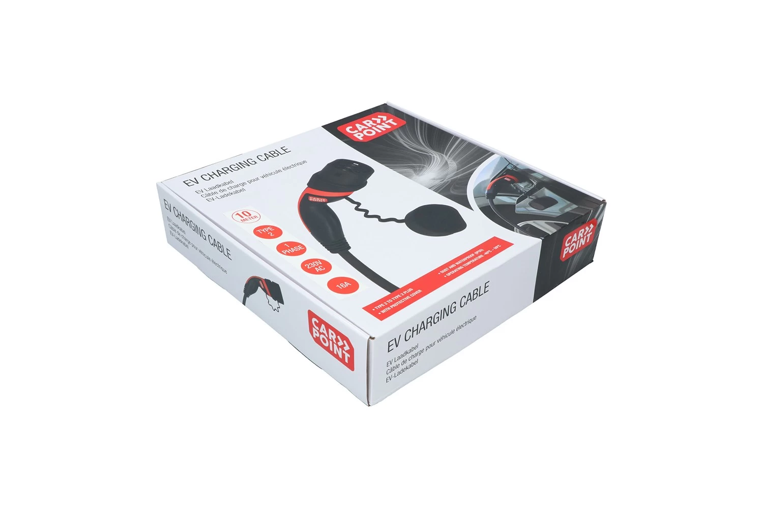 Attention! Carpoint charging cables are available in different lengths, different maximum currents and for 1- or 3-phase charging. The exact specifications of this cable can be found below. Make sure that the maximum charging current and the number of phases of the cable are at least equal to the highest values of your car. For example, if your car is suitable for 3-phase charging and you choose a 1-phase cable, you will not use the full capacity of the charger in the car and charging will be slower than what would be possible. The same applies to the current capacity: if you buy a 16A cable, while your car can handle a maximum of 32A, the cable will cause an unnecessary limitation in the charging speed.