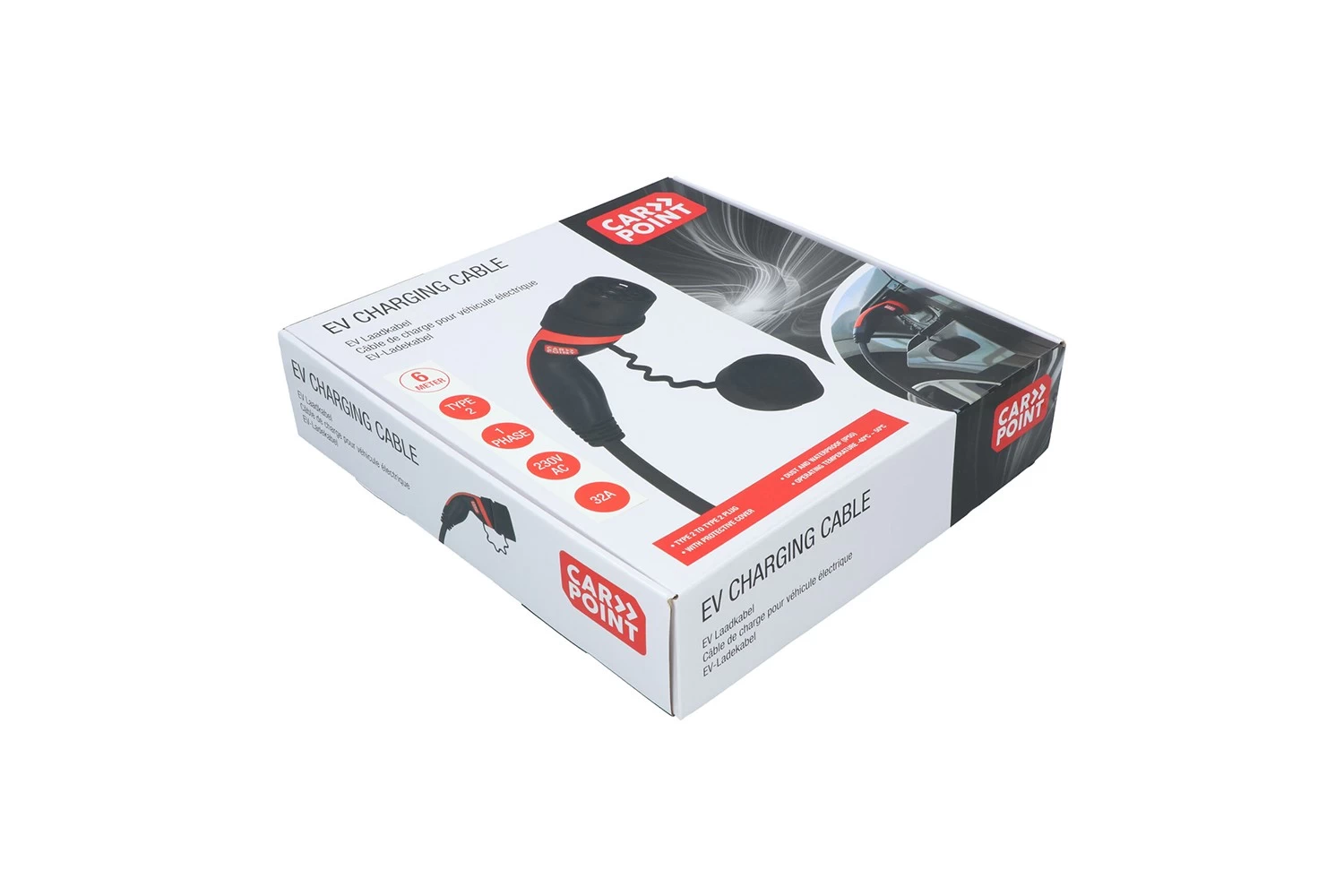 Attention! Carpoint charging cables are available in different lengths, different maximum currents and for 1- or 3-phase charging. The exact specifications of this cable can be found below. Make sure that the maximum charging current and the number of phases of the cable are at least equal to the highest values of your car. For example, if your car is suitable for 3-phase charging and you choose a 1-phase cable, you will not use the full capacity of the charger in the car and charging will be slower than what would be possible. The same applies to the current capacity: if you buy a 16A cable, while your car can handle a maximum of 32A, the cable will cause an unnecessary limitation in the charging speed.