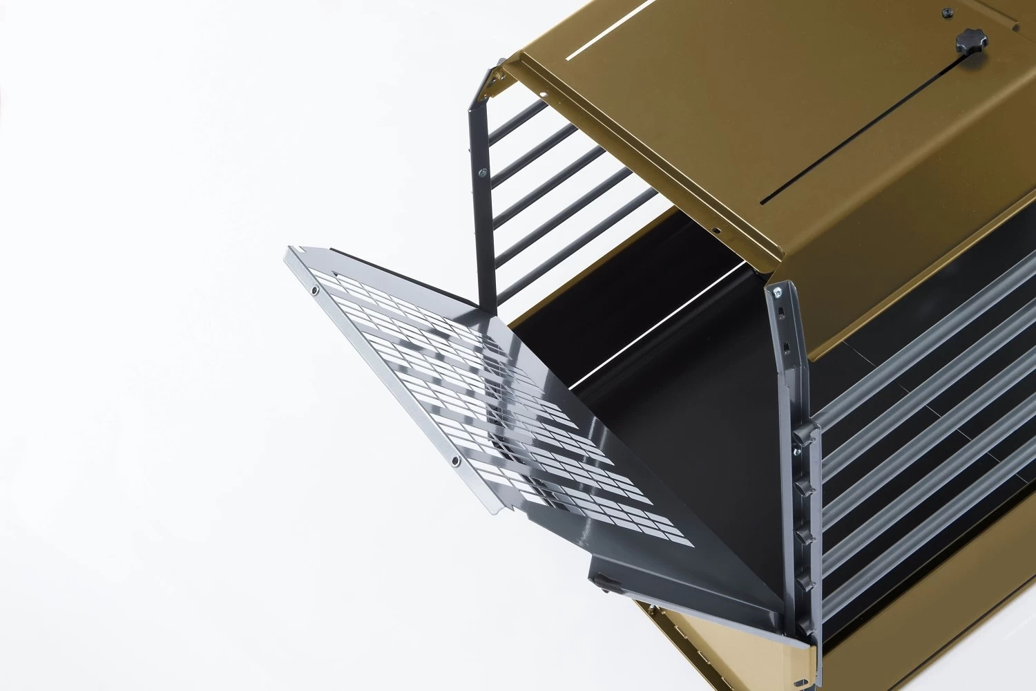The Kleinmetall VarioCage MiniMax dog crate is a premium travel cage, ensuring the best possible protection for your pet and all passengers in your Alfa Romeo Stelvio (949). The MiniMax is specially designed for a small dog or cat and features a smaller bar spacing of 5 cm (standard VarioCage models have a bar spacing of approx. 7 cm). Furthermore, the MiniMax distinguishes itself by its gold-coloured finish. The VarioCage MiniMax is equipped with a crumple zone and was crash-tested for frontal collision, rear-end collision and dropping, which is world-unique. The crash tests were performed by the SP, the swedish national testing and research institute, according to the SPCT crash method (Safe Pet Crate Test). The door has a two-step lock, to ensure that the cage remains closed in the event of a collision. Thanks to the one-hand quick release the door opens quickly and easily. A gas spring keeps the door open, while your pet is getting in or out. The dog crate is lockable with the built-in safety lock. Additionally the VarioCage door is equipped with eyes for the use of a padlock. The emergency escape hatch at the rear seat side enables the rescue of your dog in case the tailgate of the car is blocked due to an accident.