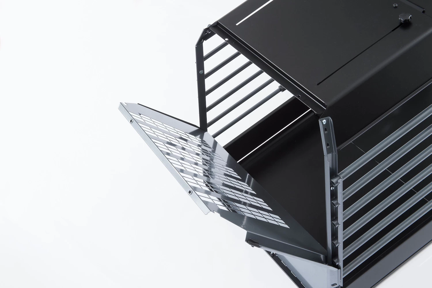 The Kleinmetall VarioCage dog crate is a premium travel cage, ensuring the best possible protection for your pet and all passengers in your Audi A4 Avant (B8). The VarioCage is equipped with a crumple zone and was crash-tested for frontal collision, rear-end collision and dropping, which is world-unique. The crash tests were performed by the SP, the swedish national testing and research institute, according to the SPCT crash method (Safe Pet Crate Test). The door has a two-step lock, to ensure that the cage remains closed in the event of a collision. Thanks to the one-hand quick release the door opens quickly and easily. A gas spring keeps the door open, while your pet is getting in or out. The dog crate is lockable with the built-in safety lock. Additionally the VarioCage door is equipped with eyes for the use of a padlock. The emergency escape hatch at the rear seat side enables the rescue of your dog in case the tailgate of the car is blocked due to an accident.
