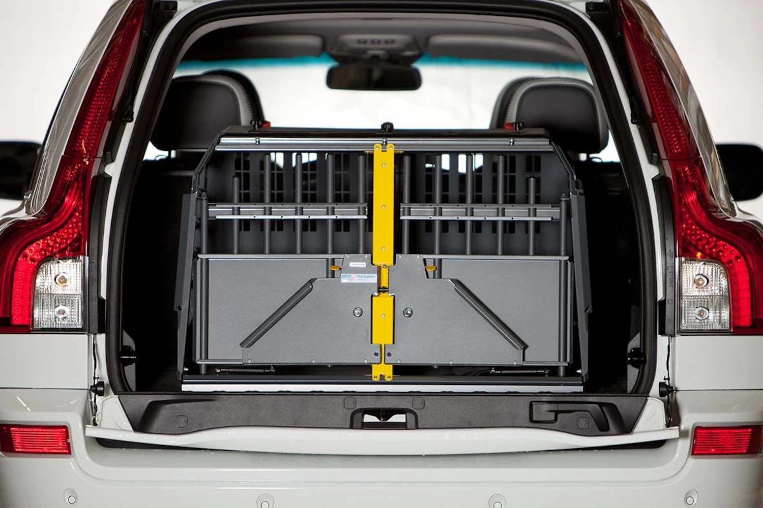 The VarioCage is available in different sizes and in two widths: single box or double box. Each VarioCage is adjustable in length and therefore fits in many car models. In order to make optimal use of the boot space, the front and back walls are slightly sloped.
