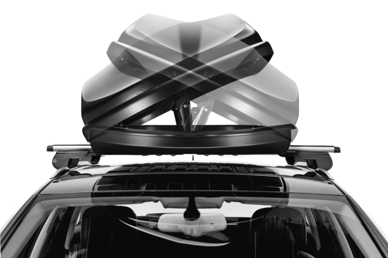 The Cruiser roof box can be opened at both sides. The dual function of the dynamic buckling springs make the loading and unloading of the roof box very simple: the buckling springs have a supportive effect when opening the lid and keep it firmly in the opened position thereafter. When closing the lid, the buckling springs pull it towards the bottom, thus ensuring a perfect sealing.
