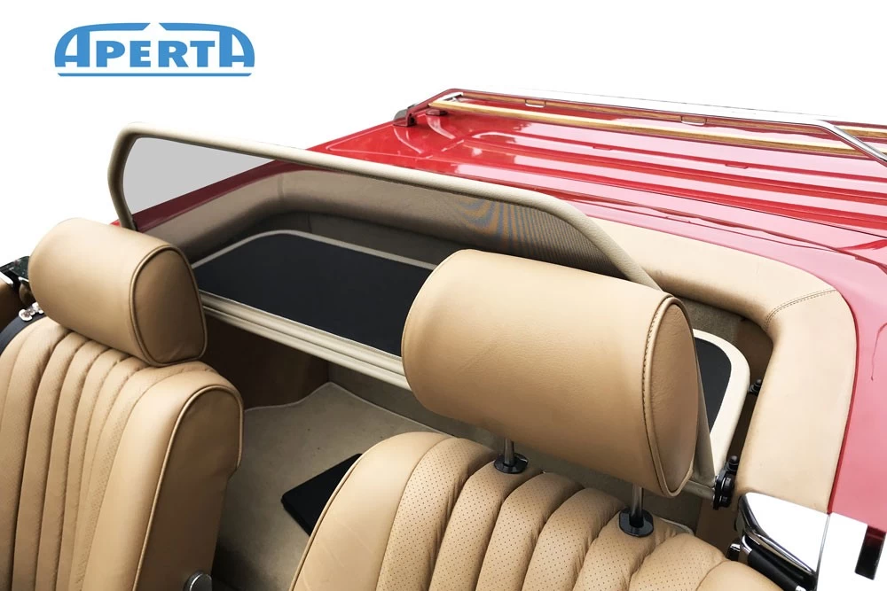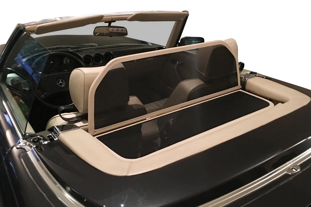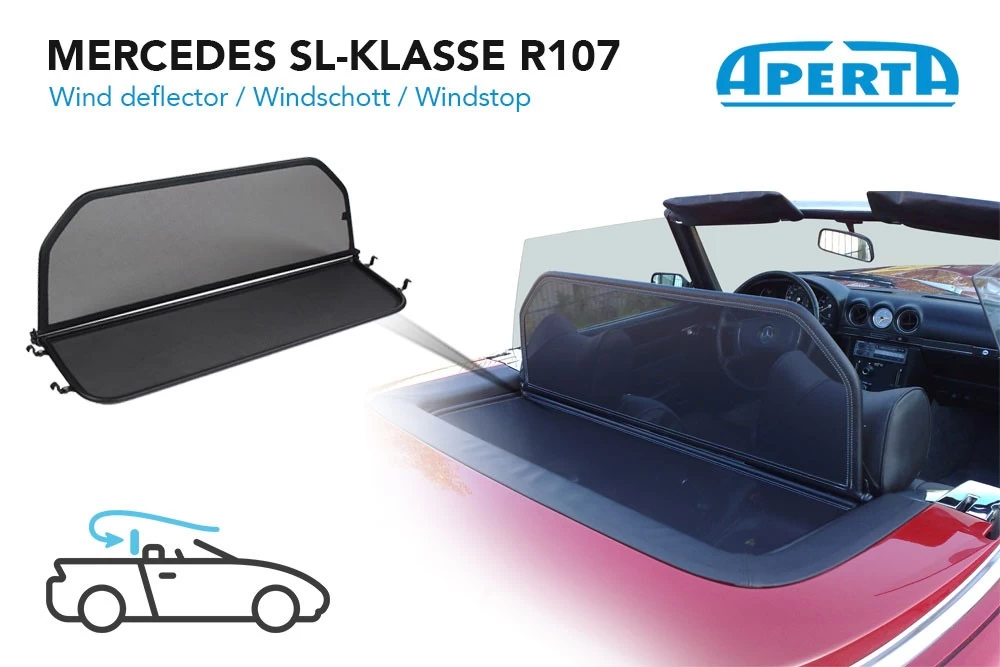 This cabriolet wind deflector from the brand Aperta is tailor-made for your Mercedes-Benz SL (R107). Aperta stands for top quality, made in Europe. The screen is easy to install, making as much use as possible of original mounting points in the car. The used wind screen fabric has come out of the tests as the best and is the least susceptible to tearing. However, it is better to protect the wind stop against sharp materials in dismounted state, for example, by ordering the matching storage bag with your wind breaker (see below under Related products). The wind deflector in the steel frame ensures a reduction in turbulence of up to 80% while driving with an open roof. The wind deflector usually remains mounted in your cabriolet after its first use. The convertible roof can still be opened and closed when the windshield is installed.
