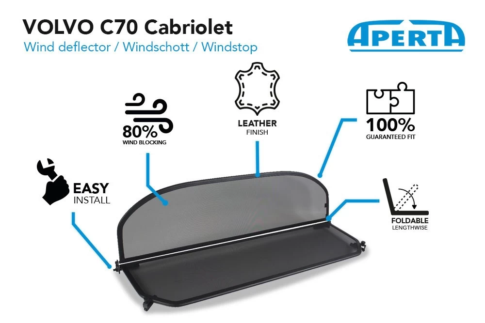 This cabriolet wind deflector from the brand Aperta is tailor-made for your Volvo C70 II. Aperta stands for top quality, made in Europe. The screen is easy to install, making as much use as possible of original mounting points in the car. The used wind screen fabric has come out of the tests as the best and is the least susceptible to tearing. However, it is better to protect the wind stop against sharp materials in dismounted state, for example, by ordering the matching storage bag with your wind breaker (see below under Related products). The wind deflector in the steel frame ensures a reduction in turbulence of up to 80% while driving with an open roof. The wind deflector usually remains mounted in your cabriolet after its first use. The convertible roof can still be opened and closed when the windshield is installed.